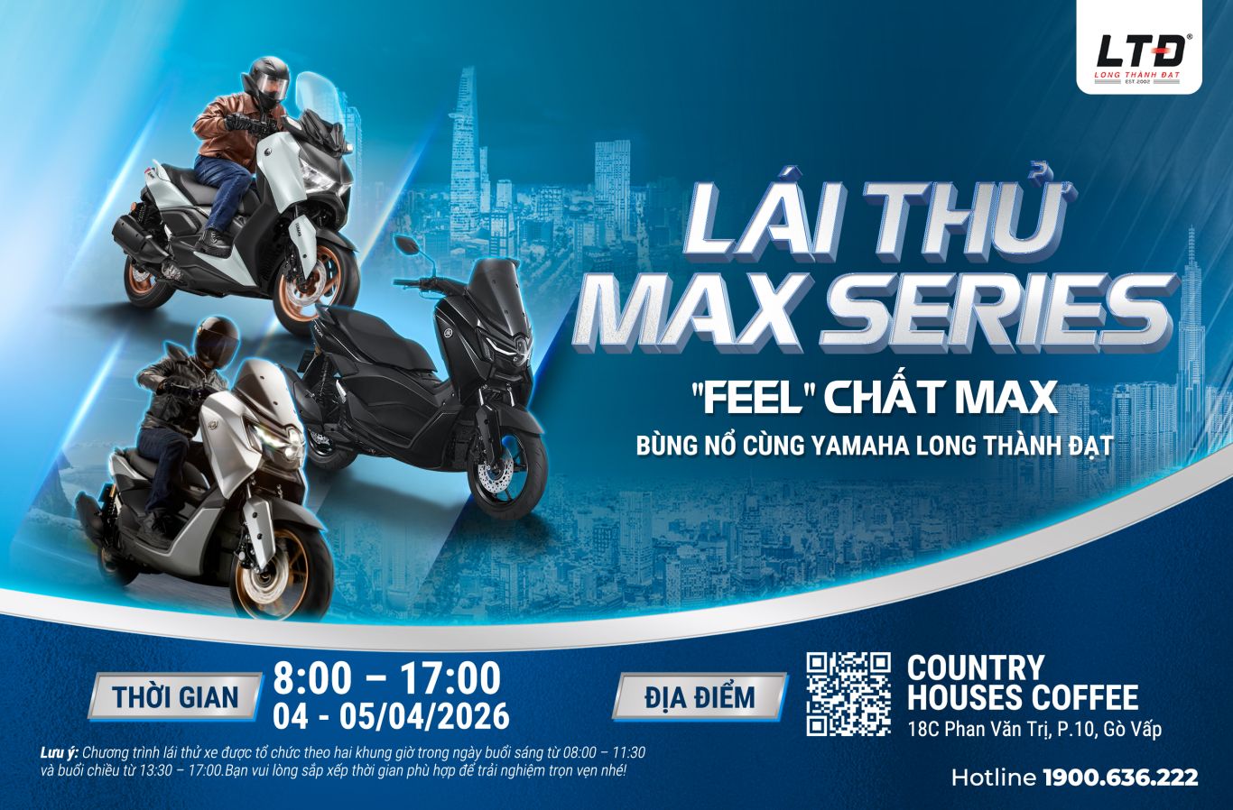 Yamaha Long Thành Đạt tổ chức sự kiện lái thử MAX Series trong hai ngày 04 – 05/04/2026, tại Country Houses Coffee, 18C Phan Văn Trị, Phường 10, Quận Gò Vấp.